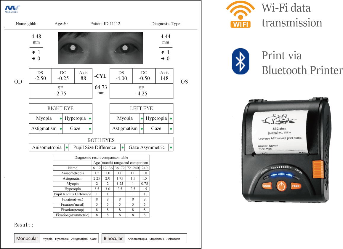 V100 можна підключити до Wi-Fi або Bluetooth, щоб роздрукувати результати на термопринтере, або з Mediview на звичайному принтері.