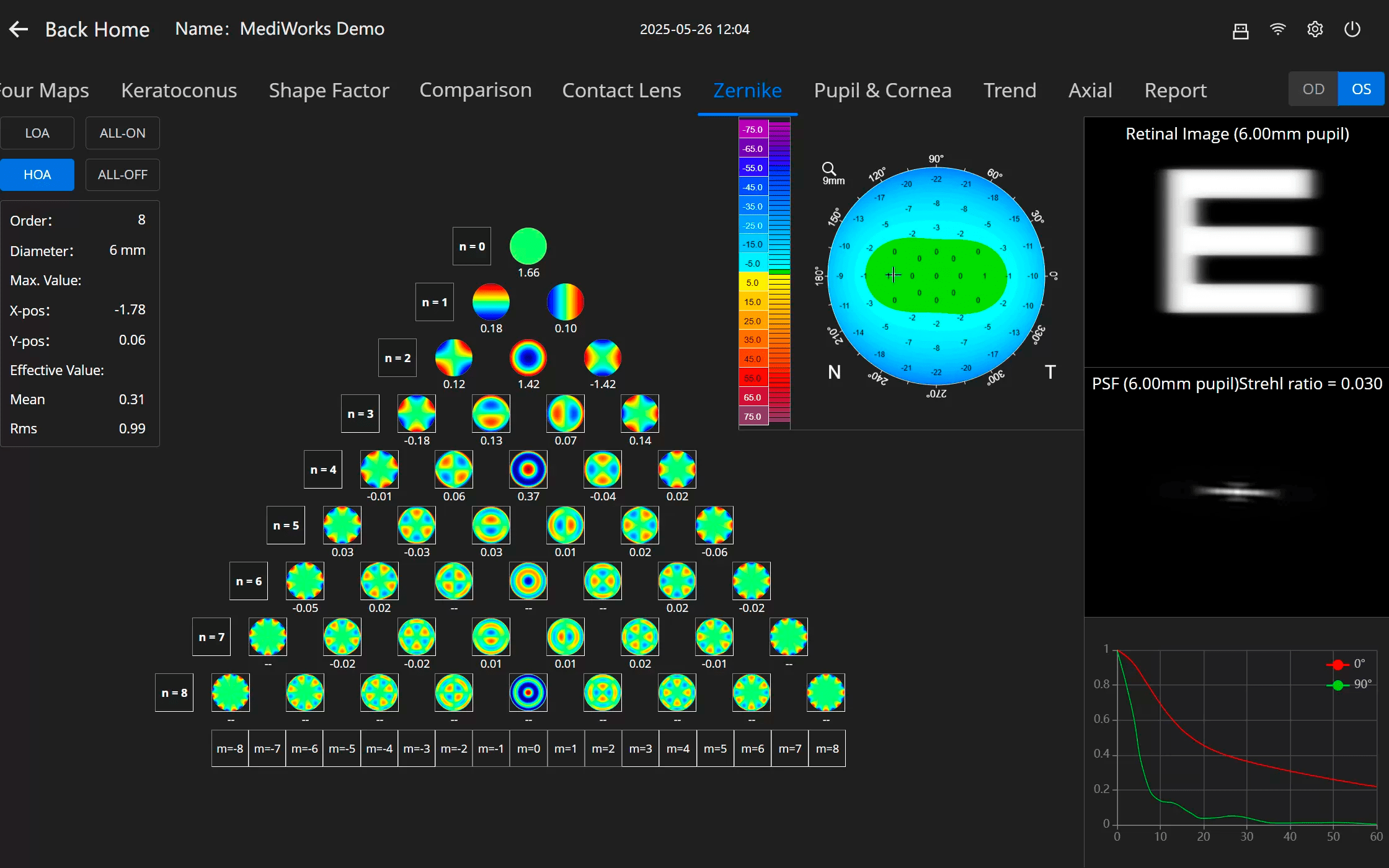 Біометр надає дані про аберацію хвильового фронту Зерніка передньої поверхні рогівки до 8-го порядку та з максимальним діаметром 12 мм. Також може моделювати якість зору за допомогою візуалізація сітківки, функція розсіювання точки (PSF, включаючи коефіцієнт Стреля) та функція передачі модуляції (MTF).