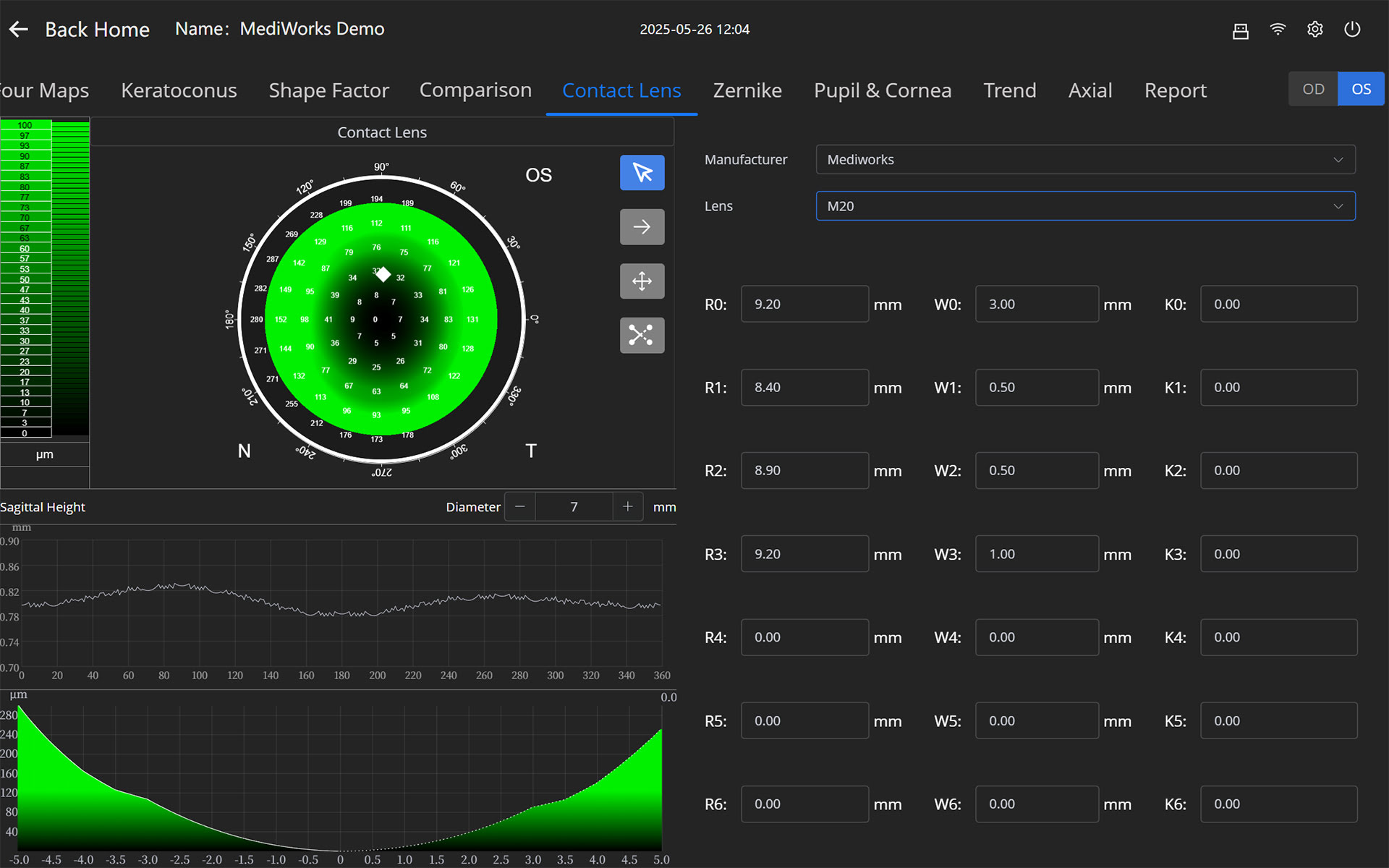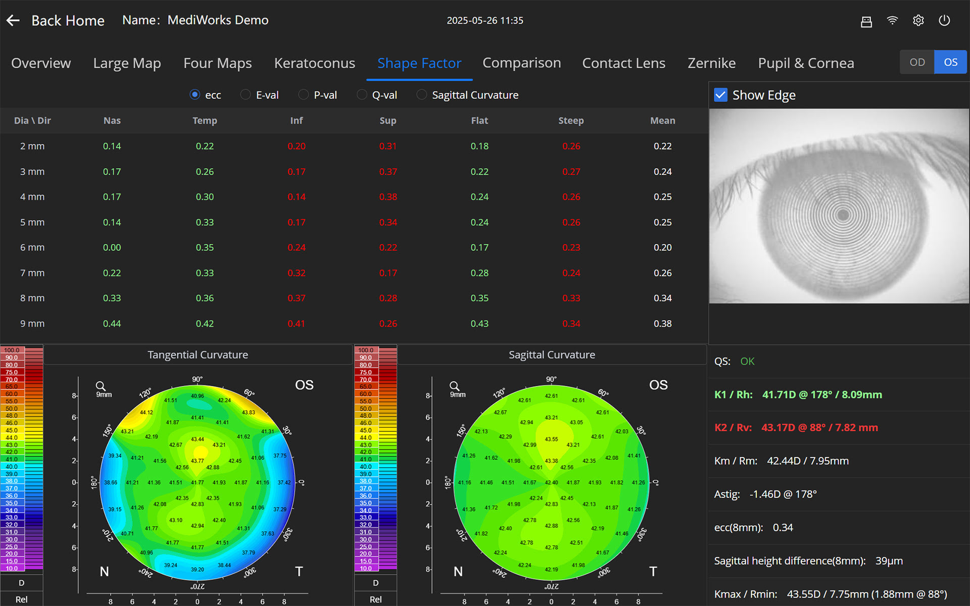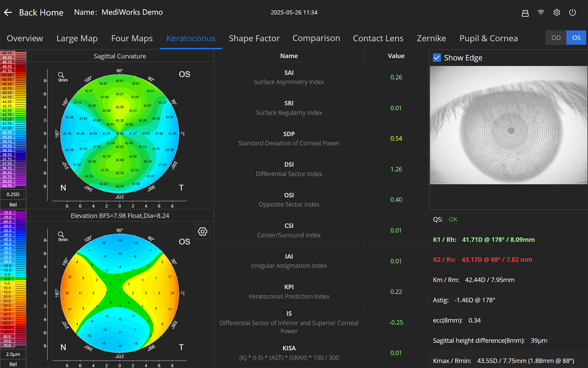 Прилад надає карти сагітальної кривизни та висоти передньої частини рогівки, а також різноманітні показники кератоконусу, що дозволяє офтальмологам інтуїтивно та швидко зрозуміти морфологію рогівки пацієнта та сприяє ранньому виявленню таких захворювань, як кератоконус та крайова дегенерація рогівки.