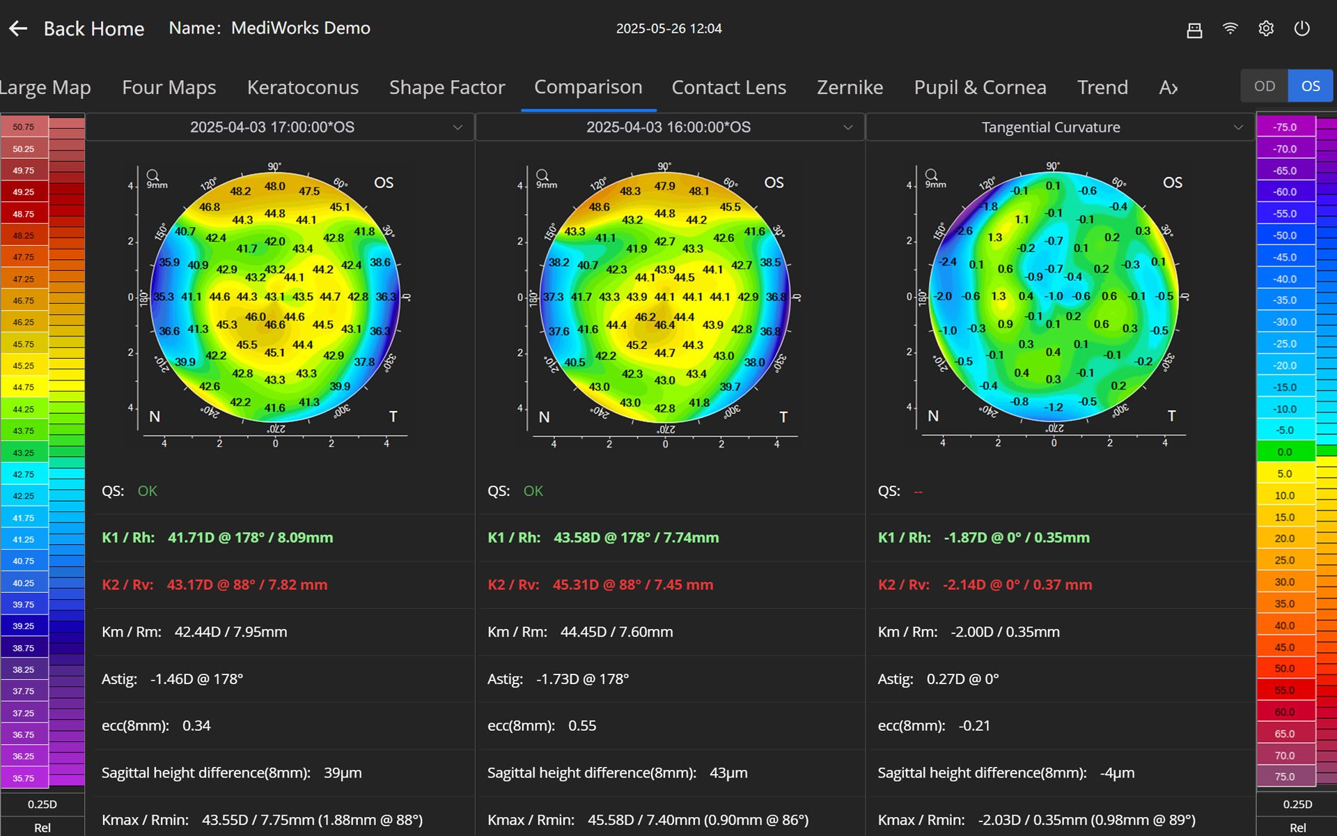 AL550 надає карту тангенціальної різниці кривизни до та після носіння лінз, що може допомогти фахівцям з догляду за очима оцінити ефект носіння ортокератологічних лінз.