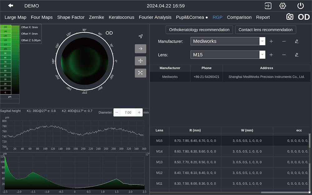 На основі рогівки пацієнта буде створено симульоване флуоресцеїнове зображення. Система порекомендує кілька відповідних лінз на вибір, що прискорює робочий процес і виключає непридатні лінзи, щоб позбавити пацієнта від необхідності робити кілька реальних флуоресцентних фарбувань.