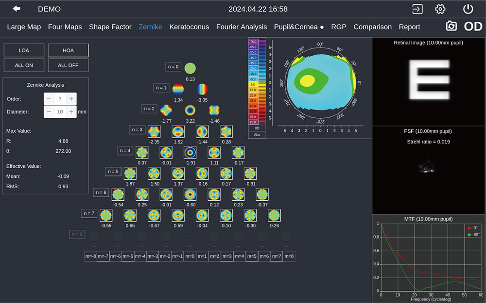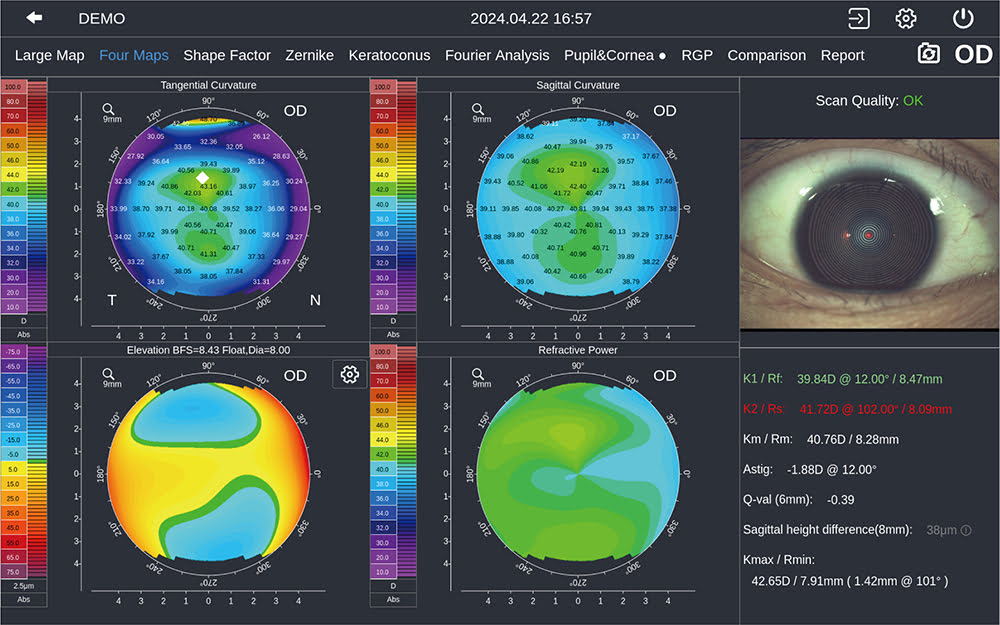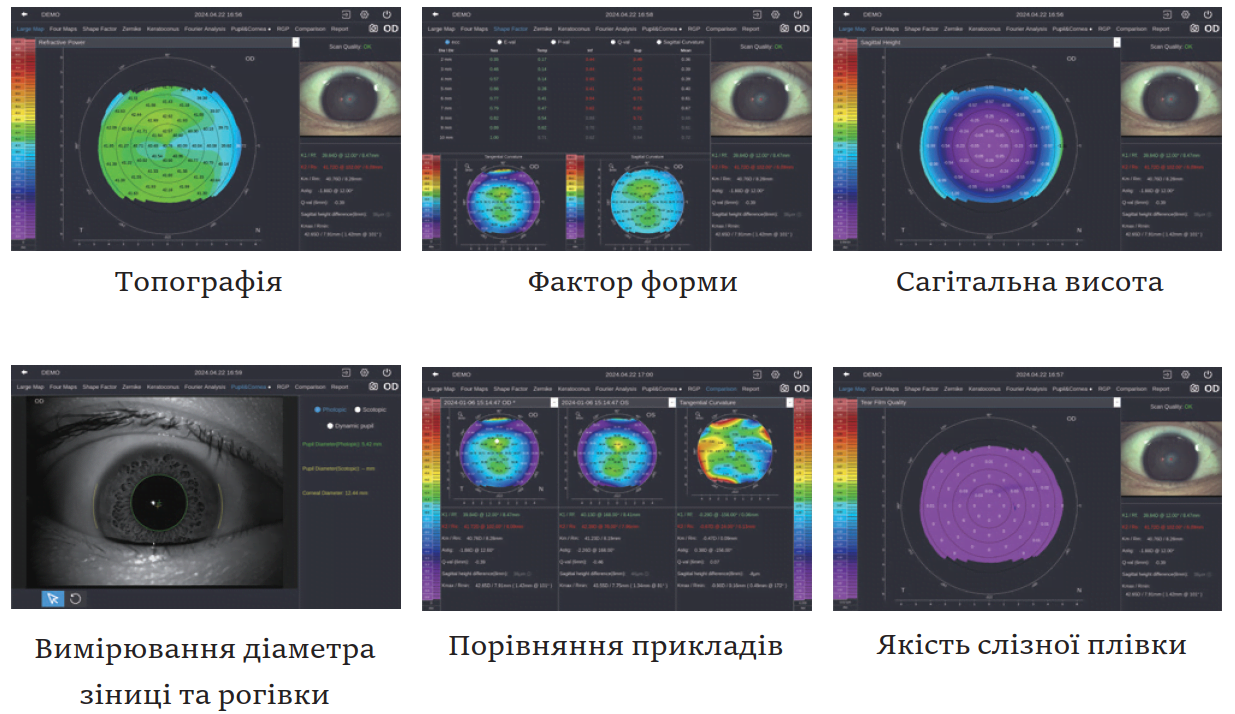 4 карти показують сагітальну кривизну, тангенціальну кривизну, карту висот, показник заломлення та значення K1/K2/Km/Astig/Ecc.