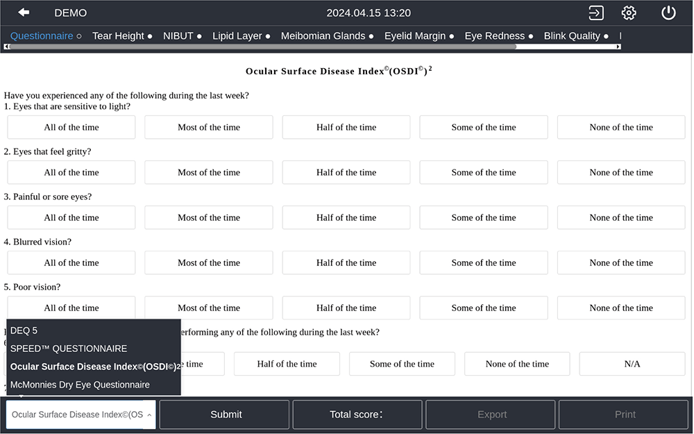 Вбудований опитувальник сухого ока розроблений відповідно до факторів ризику та клінічних характеристик сухого ока, забезпечуючи просту попередню оцінку сухого ока, підвищуючи ефективність діагностики та лікування, а також полегшуючи подальше спостереження за пацієнтом.