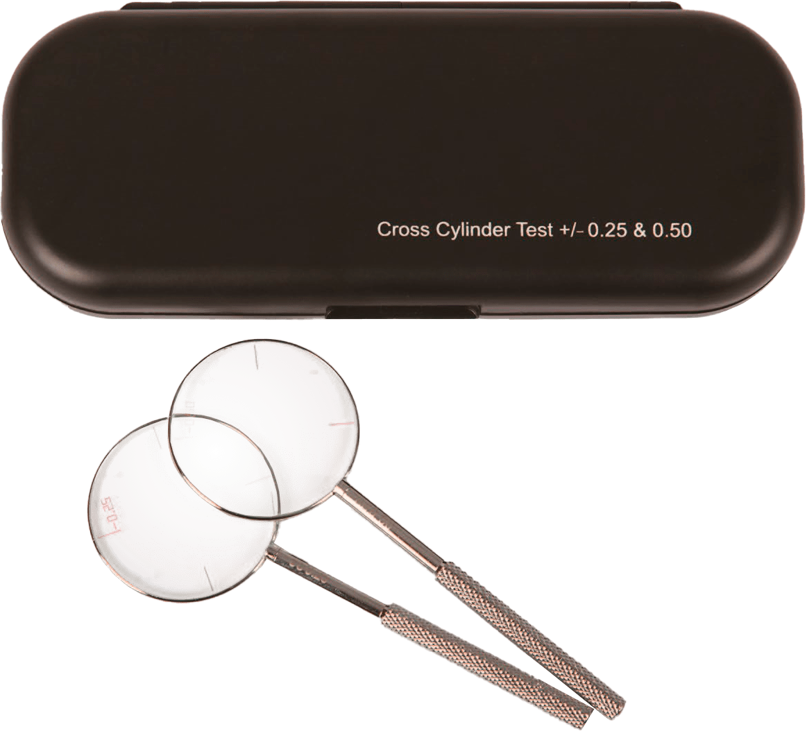 Крос-циліндр комплект з 0.25D/0.50D — інструмент, розроблений для уточнення остаточного підбору корекційних лінз у процесі суб'єктивної рефракції. Його використання дозволяє оптимізувати рецептуру, забезпечуючи пацієнтам ідеальну корекцію зору.