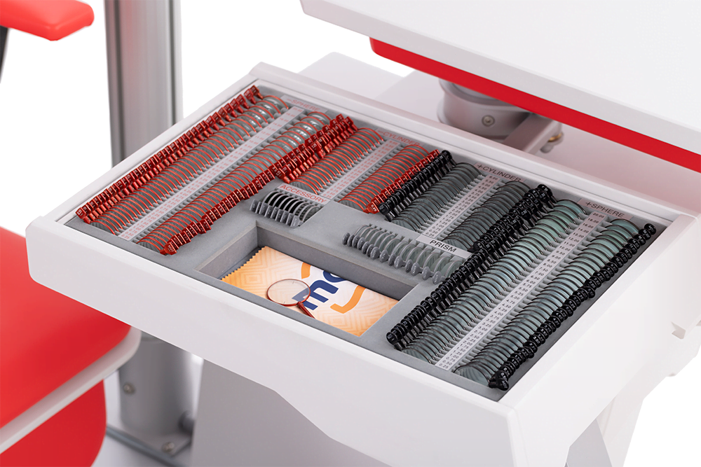 Під стільницею, розташований поворотний кронштейн з лотком на 260 лінз і місце для пробної оправи